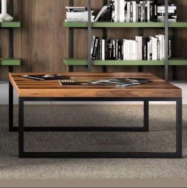 Fabricado con tablón de madera sólida y base de metal.