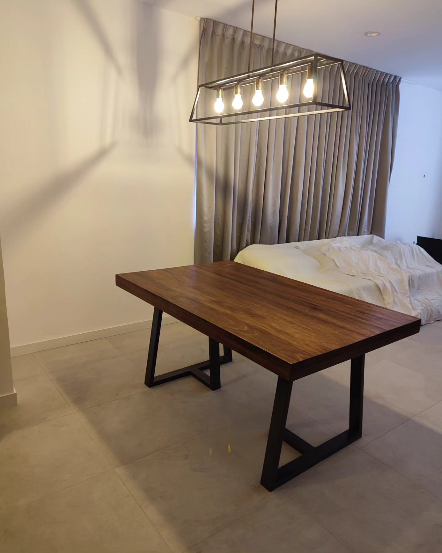 Mesa madera sólida seike tablón espesor 4 cms medida 1,60*90*77 alto base hierro tubo 7*3 cms pintura electrostática al horno, diseño moderno para 6 puestos.